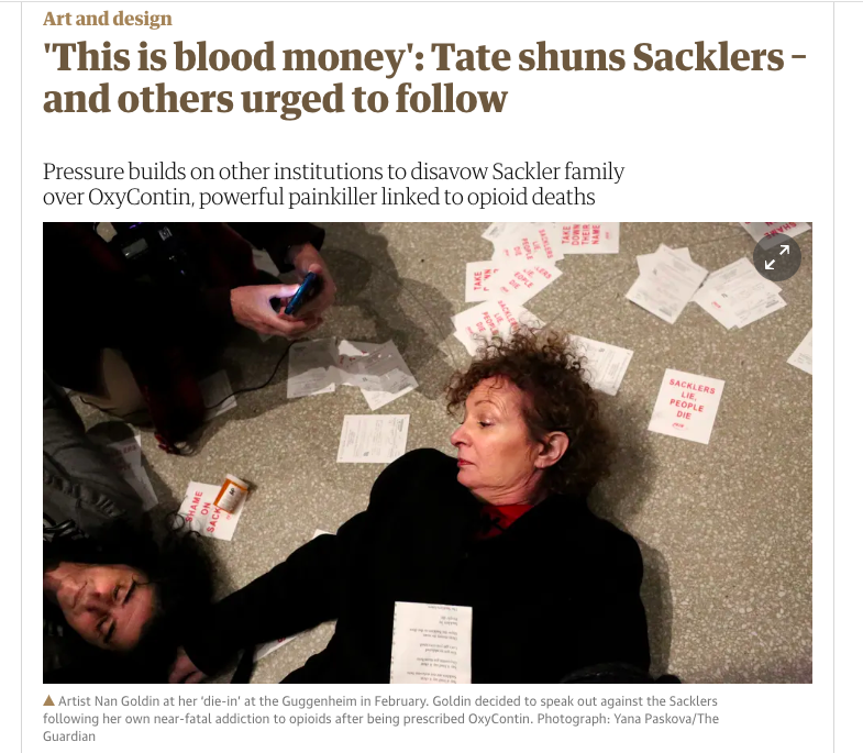 - Tate has additionally been called out after its partnership with the Sackler family - artists like Nan Goldin protested against the drug Oxycontin widely prescribed in America - protested at the Guggenheim with posters, 'Sacklers lie. People die.'